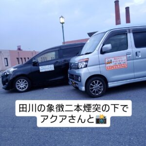 最後はお互いの車を田川のシンボルの2本煙突をバックに写真を撮りました📷